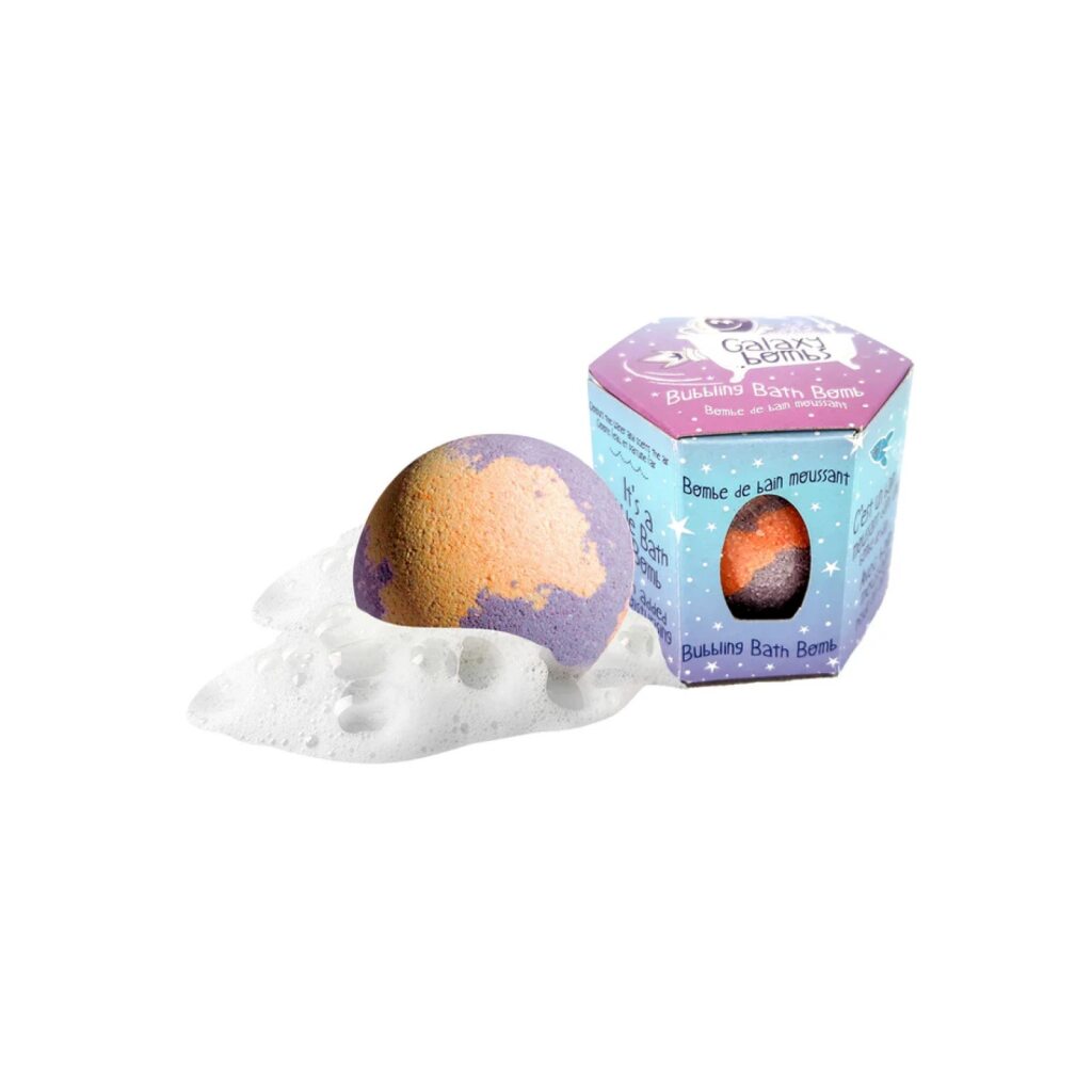 Galaxy Bombs™ are small kid -sized bath bombs that release bubbles when dropped in the water.