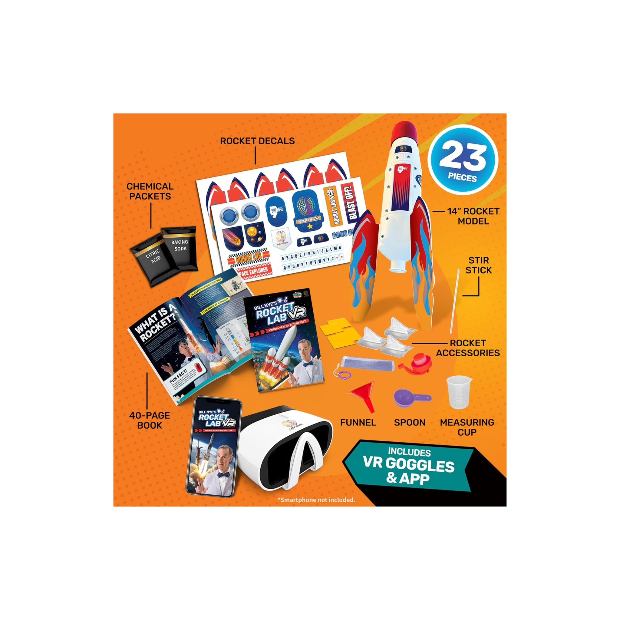 Activity set includes: 23-piece rocket kit, 40-page book, and VR goggles compatible with all smart phones (but not tablets)