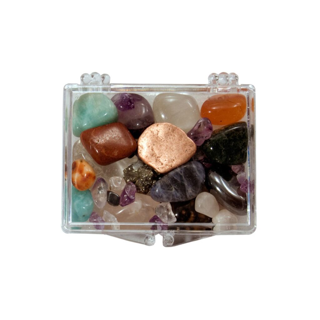 A handy box filled with fascinating rocks found in Canada. Each box may include an assortment of rose quartz, quartz crystal, bornite, amazonite, sodalite, pyrite, amethyst, hematite, copper, labradorite, jade, rhodonite, and fluorite.